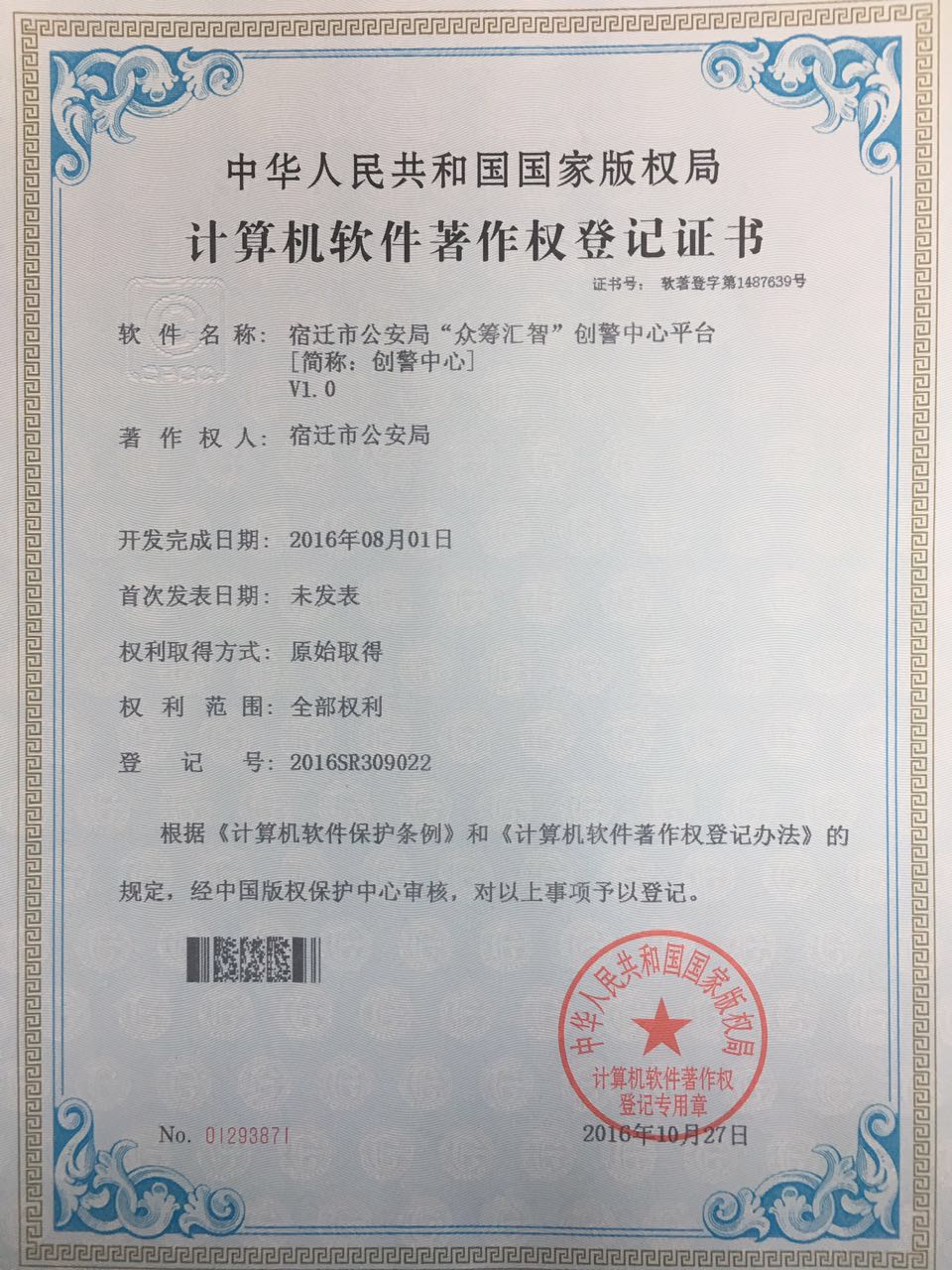 近日,由我司同宿遷市公安局自主研發(fā)的宿遷市公安局“眾籌匯智”創(chuàng)警中心平臺(tái)成功獲得軟件著作權(quán)登記證書(shū)。 市局研發(fā)的創(chuàng)警中心平臺(tái)為國(guó)內(nèi)首次發(fā)布,系市局首個(gè)自主開(kāi)發(fā)、擁有自主版權(quán)的計(jì)算機(jī)軟件。此次軟件著作權(quán)的取得,對(duì)外展示了我...